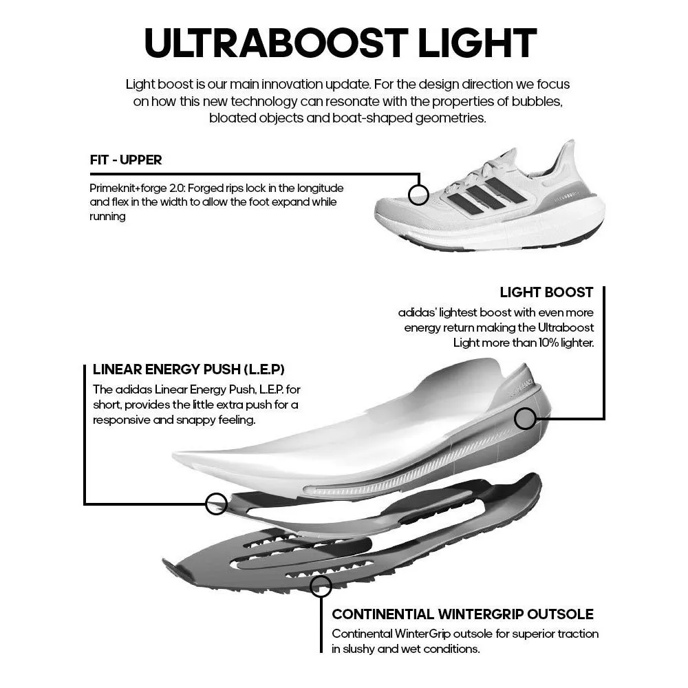 A magia está na entressola Light BOOST, uma nova geração de adidas BOOST com ainda mais retorno de energia.