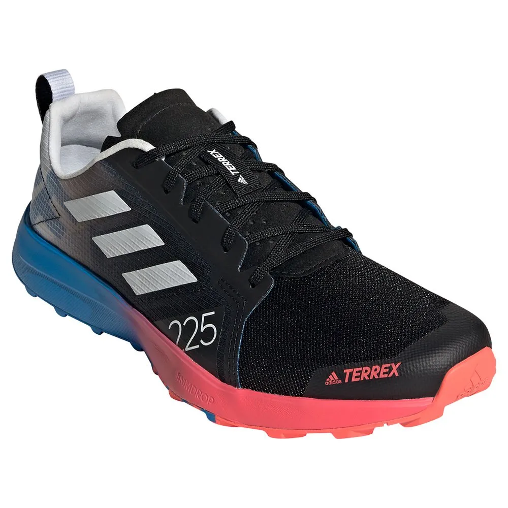 A parte superior ultraleve Primegreen do Terrex Speed Flow reduz seu peso para uma média de 225 gramas e melhora o fluxo de ar através do calçado para maior conforto e estabilidade. A combinação de reforços selados a quente no meio do pé e na biqueira e um fechamento de renda de baixo perfil fornecem um suporte preciso e eficiente, enquanto a silhueta anatômica oferece uma sensação natural, quase descalço.