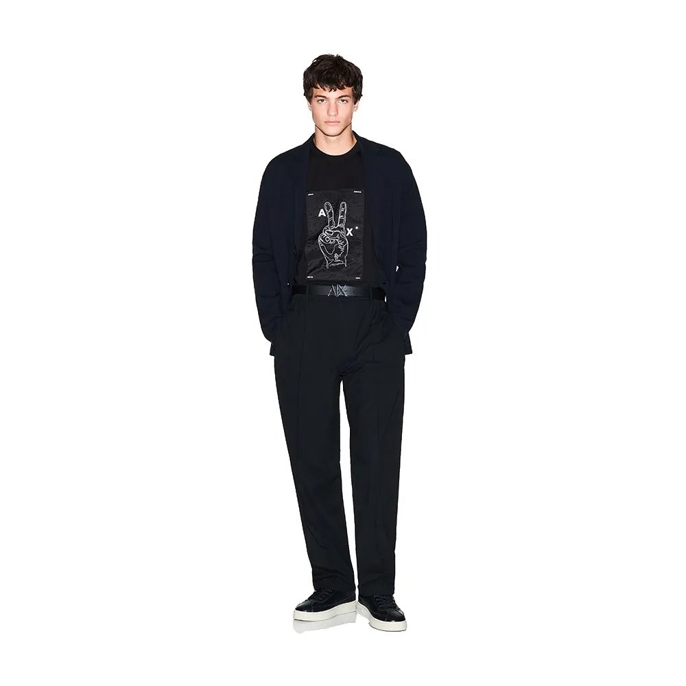 As principais características foram cuidadosamente projetadas para criar uma silhueta que seja atemporal e distintamente contemporânea. O design trespassado é preso com um fecho clássico de dois botões, criando uma frente limpa e simplificada. Uma característica definidora é a lapela de pico afiada, um detalhe emprestado da alfaiataria de alta qualidade que adiciona um toque de autoridade e interesse visual, alargando os ombros para um perfil poderoso e confiante. Complementando este detalhe formal estão os bolsos de remendo casuais, que conferem ao blazer uma sensação relaxada e acessível, tornando-o incrivelmente fácil de usar com uma simples camiseta e jeans. Esta fusão inteligente de elementos formais e casuais é a marca registrada da estética Armani Exchange.