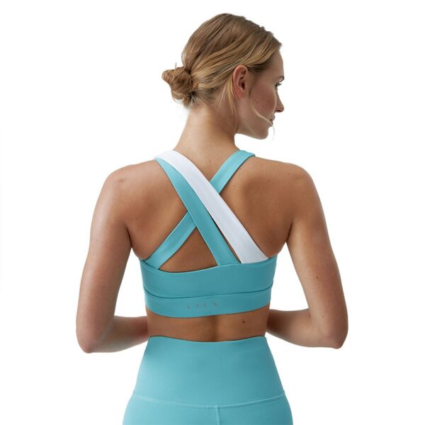 Top esportivo bicolor com assimetria para um look elegante, com sustentação média-alta, com alças cruzadas confortáveis.