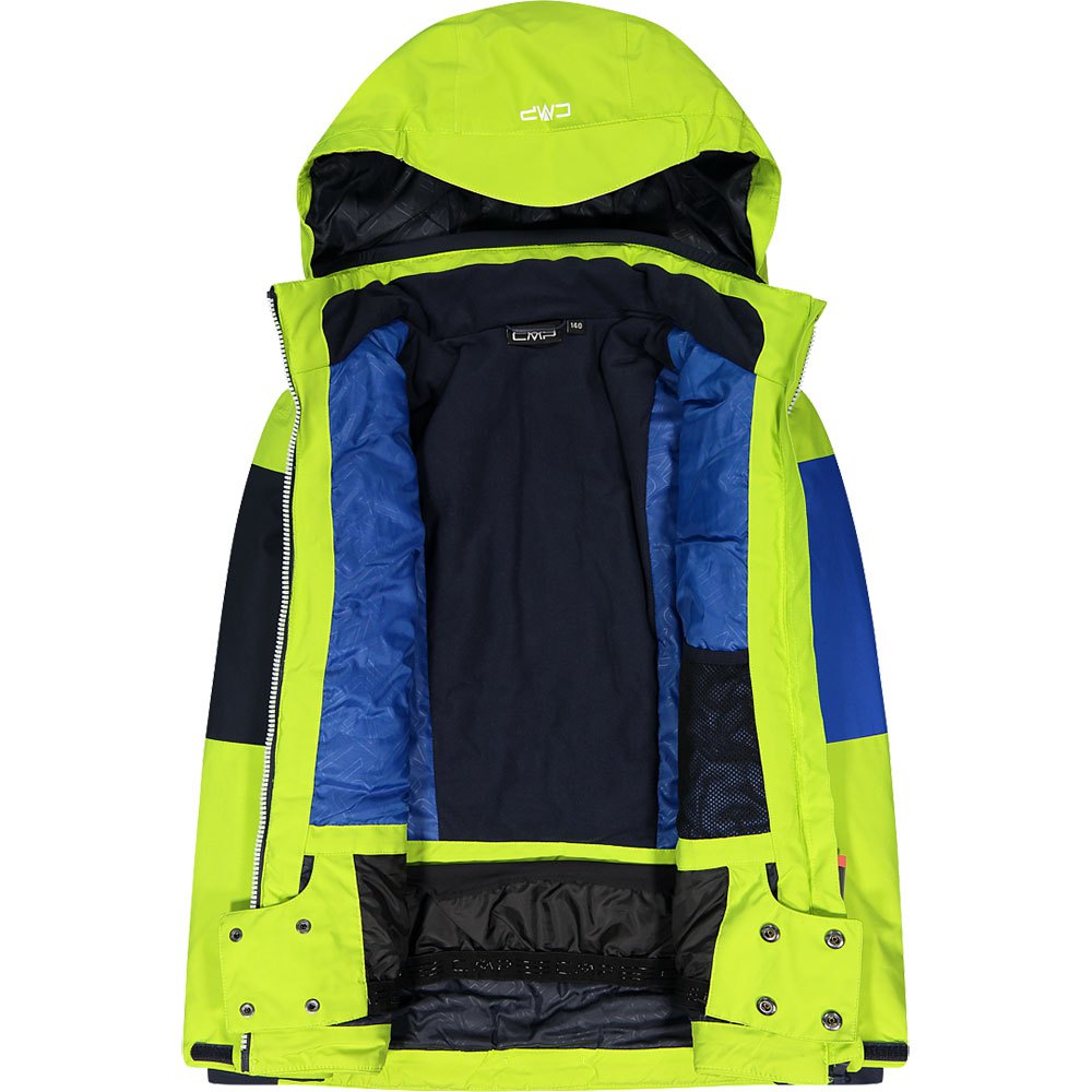 Existem inúmeros detalhes funcionais, como punhos ajustáveis com interior de Lycra com abertura para o polegar, zíper frontal com aba à prova de vento e atrito, bainha com cordão ajustável, dois bolsos laterais com zíper e bolso para passe de esqui na manga.