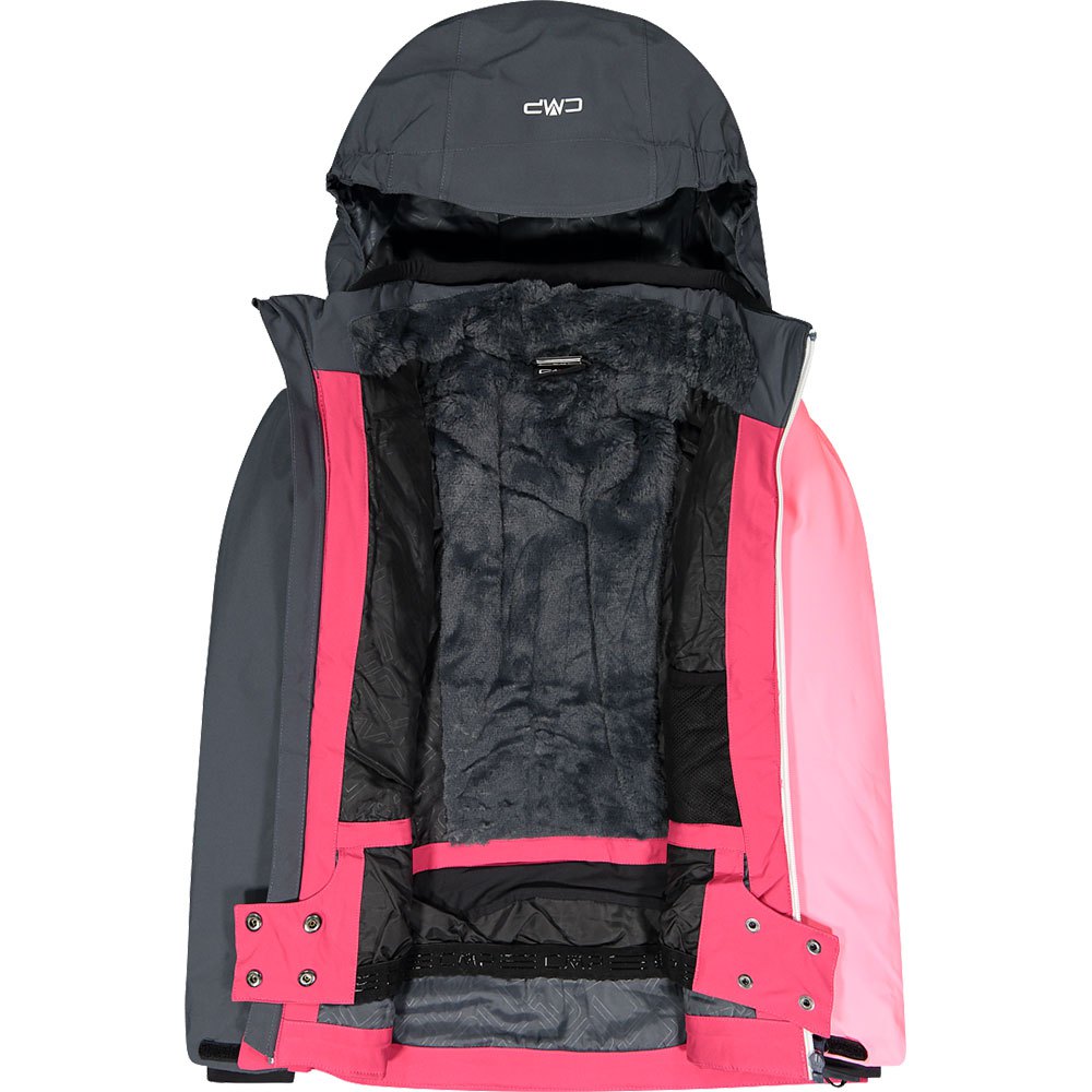 Casaco com punhos ajustáveis com velcro e punhos internos de lycra com abertura para o polegar, zíper frontal com aba contra vento e atrito, barra com cordão ajustável, dois bolsos laterais com zíper e bolso para passe de esqui na manga.