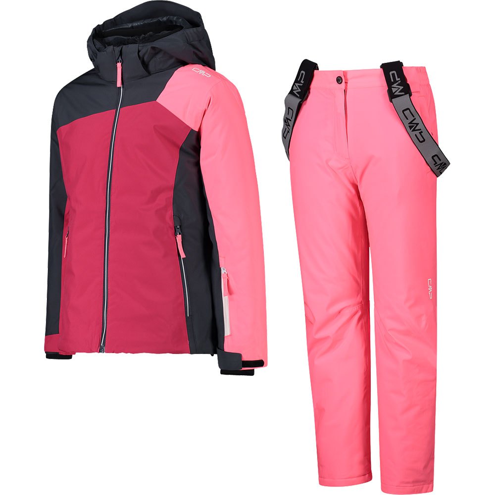 Conjunto de esqui composto por casaco com capuz removível e calças com suspensórios.