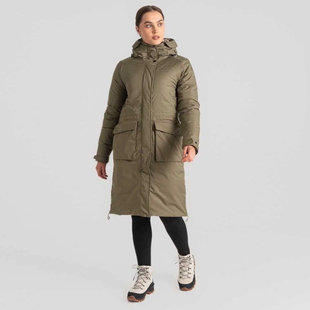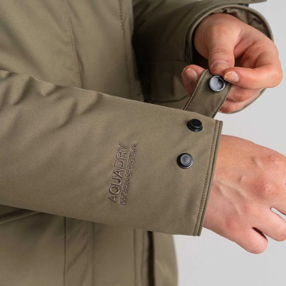 – Tecido à prova d´água de camadas duplas fundidas AquaDry Membrane, 40´´ de comprimento, aba de tempestade de fixação de pregos com guarda de zíper interno e zíper de fecho na frente central de duas vias, regulador de cintura interno de cordão, zíperes laterais, capuz colado com reguladores de cavilha para ajuste total da coroa e virar para trás da crista, reguladores de punho de tecido auto-fixadores, 6 bolsos, 2 inferiores com fecho de pregos bolsados com luvas de mão laterais com zíper, 1 bolsos interno com zíper e 1 bolsos internos elásticos para acessórios, classificação de calor 2.
