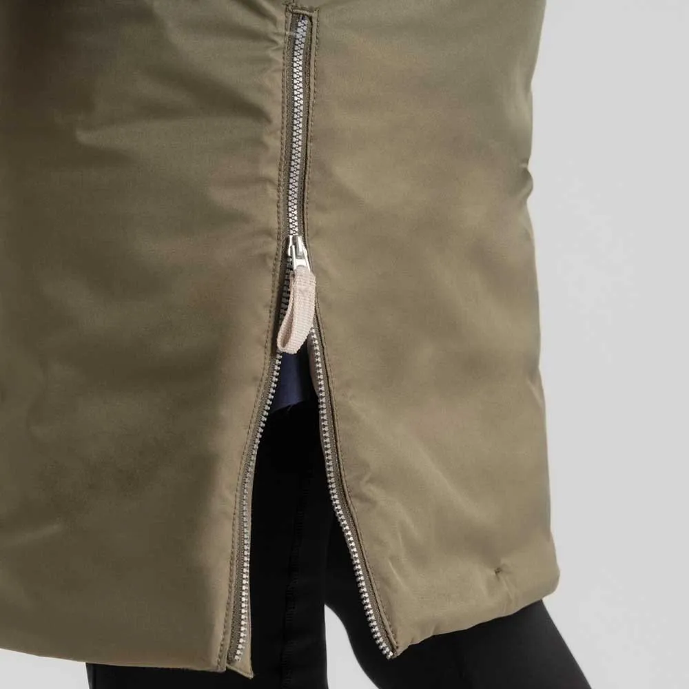 Parte de poliéster reciclado peached com membrana AquaDry e acabamento EcoShield DWR, parte de forro lux de poliéster reciclado com EcoSheild DWR, enchimento de fibra oca de poliéster reciclado e parte de fitas de zíper recicladas.