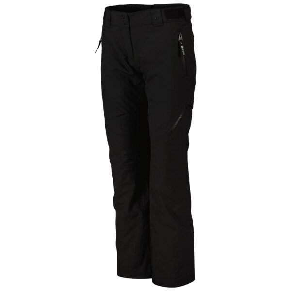 – Características de esqui (incluindo polainas de neve e uma bainha com zíper na barra)