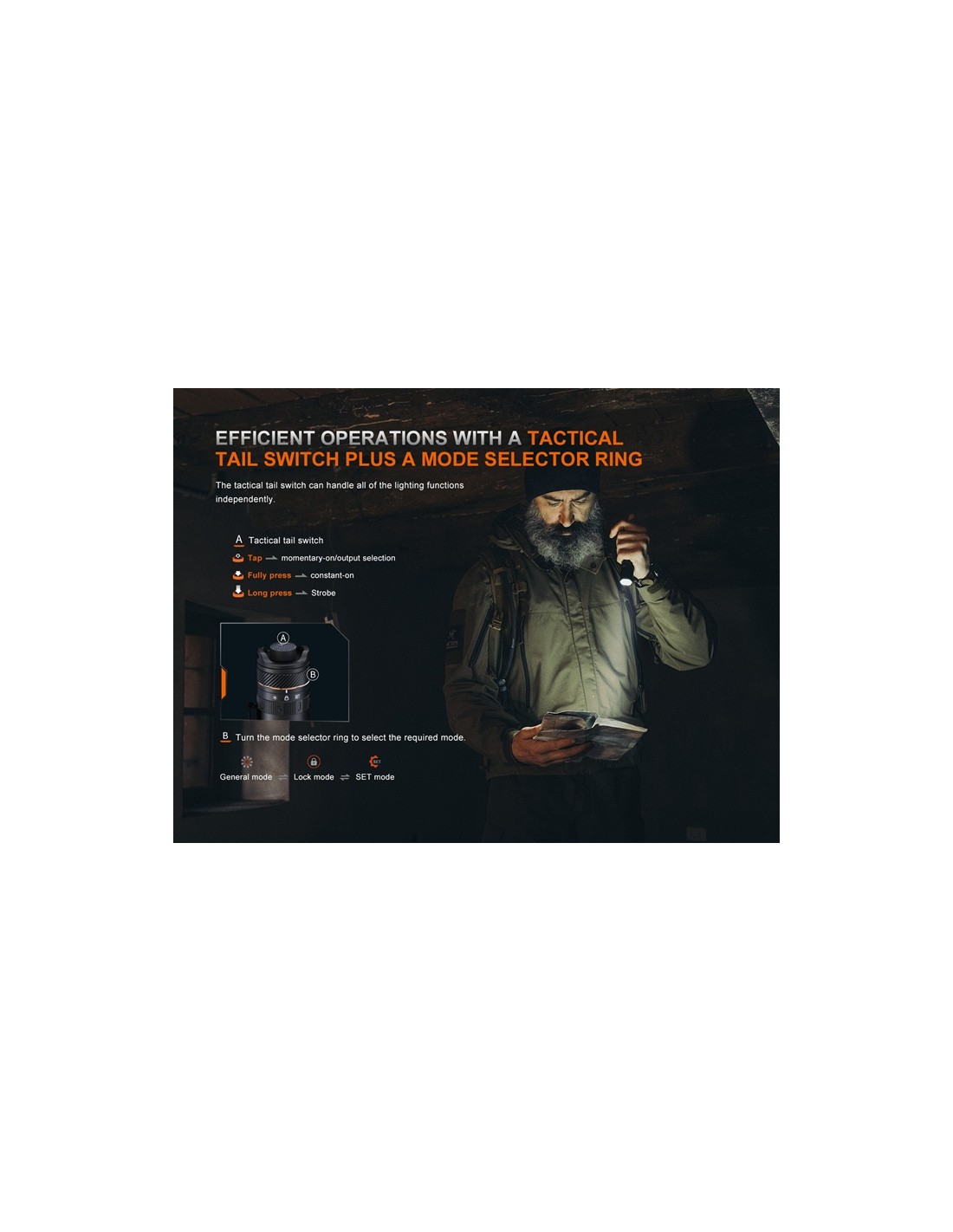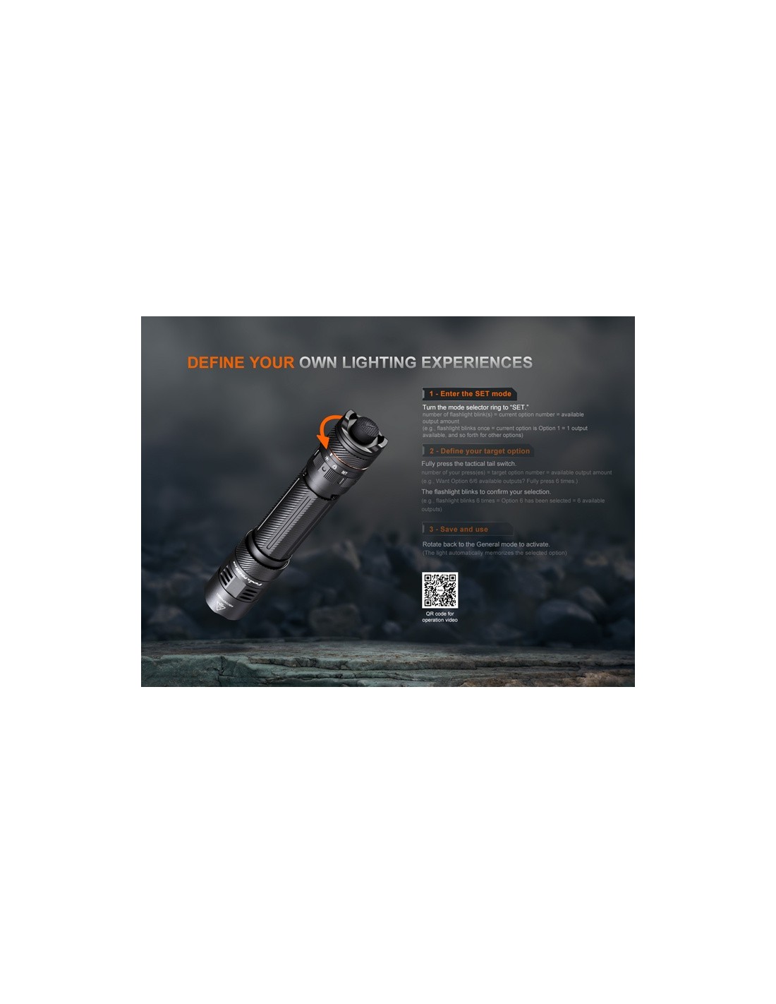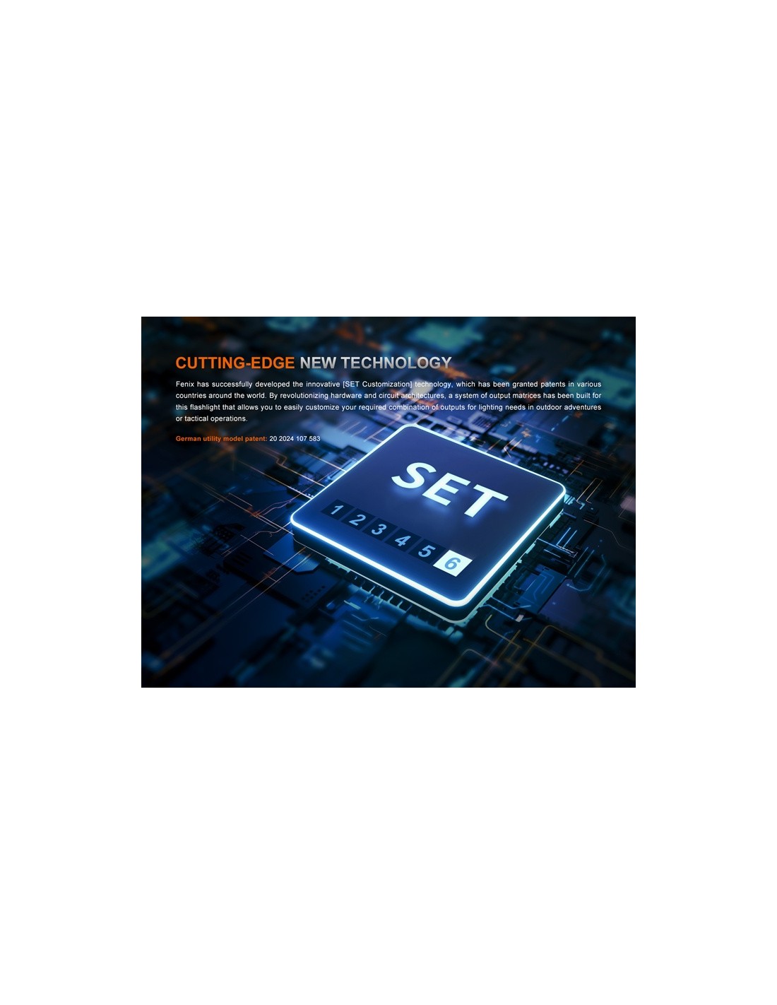 Seu design inovador do modo SET permite alternar rápida e facilmente entre vários modos de iluminação, com base em diferentes cenários de aplicação e preferências pessoais. A seleção de saída, a função de bloqueio, a alternância de modo e a definição de modo são simples e precisas. Todos esses recursos permitem que a lanterna atenda a uma variedade de necessidades de iluminação, tanto em atividades ao ar livre quanto em operações táticas.