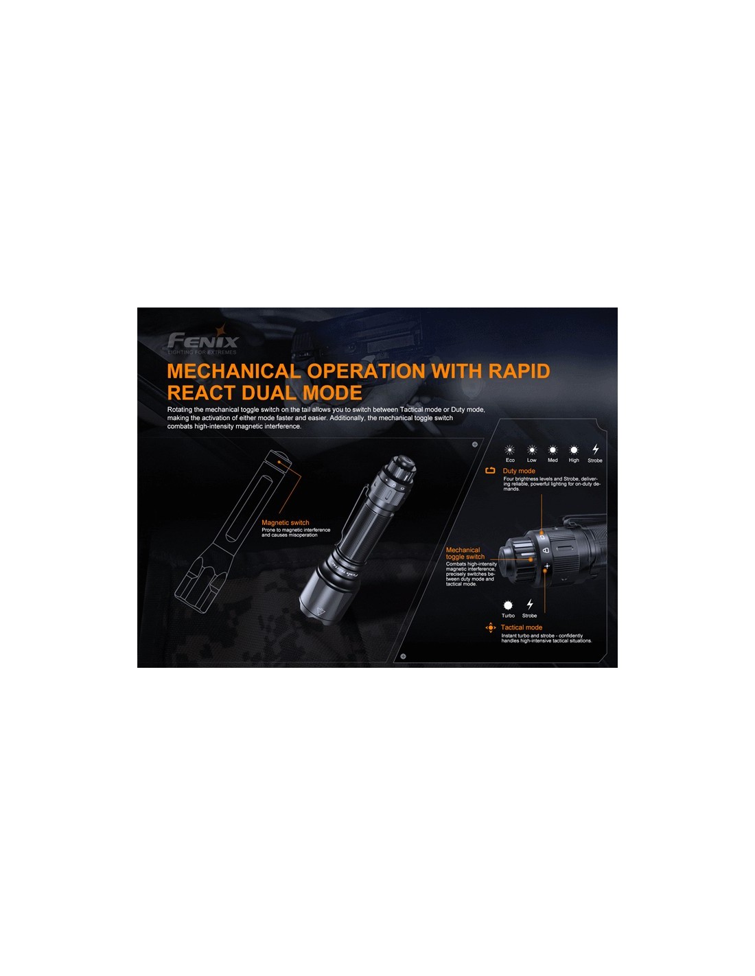 - Interruptor tático patenteado de dupla função para ativação tática instantânea.
