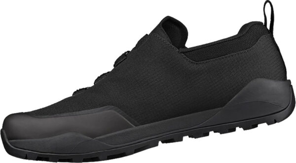 O padrão Ergolace envolve o pé, garantindo o ajuste com um fecho de cadarço ergonômico. A parte superior oferece proteção contra os elementos: seu tecido ripstop resistente resiste a rasgos e rasgos. Uma biqueira PUlaminada e reforços laterais adicionam mais proteção e durabilidade. A Fizik projetou a silhueta especificamente para reduzir o volume e evitar a aparência inchada de muitos sapatos de mountain bike – ela está pronta para se misturar com a civilização quando as missões no interior forem concluídas.