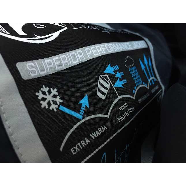 Fecho de correr completo à prova de água na frente, bolso à prova d’água com zíper no peito e dois bolsos de lados grandes na frente com zíperes verticais cobertas por uma ampla aba protetora. Bolso interior com porta com zíper. Todos estes bolsos fornecem armazenamento prático.