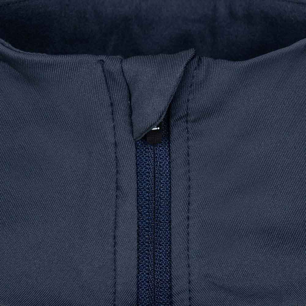A gola alta com fecho é finalizada com uma proteção de queixo.