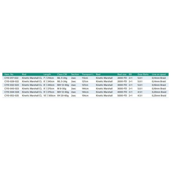 Pesque o sistema elegante e perfeitamente combinado de sua escolha com nosso combo de fiação Kinetic Marshall CL. Desfrute do desempenho suave de uma de nossas bobinas mais populares, além da sensação sedosa de uma haste premium, com grande economia em relação ao preço de compra separado! Construído para durabilidade leve, nosso carretel giratório Kinetic Marshall apresenta um corpo de composto de carbono e placas laterais, um carretel de alumínio anodizado duplo usinado e um eixo principal de aço inoxidável resistente à corrosão. Vem com 4 tranças no carretel. Nossa haste giratória Kinetic Marshall CL é construída em nosso blank de grafite CL premium com guias leves de pé único, assento do carretel em branco exposto e alça EVA sem deslizamento.