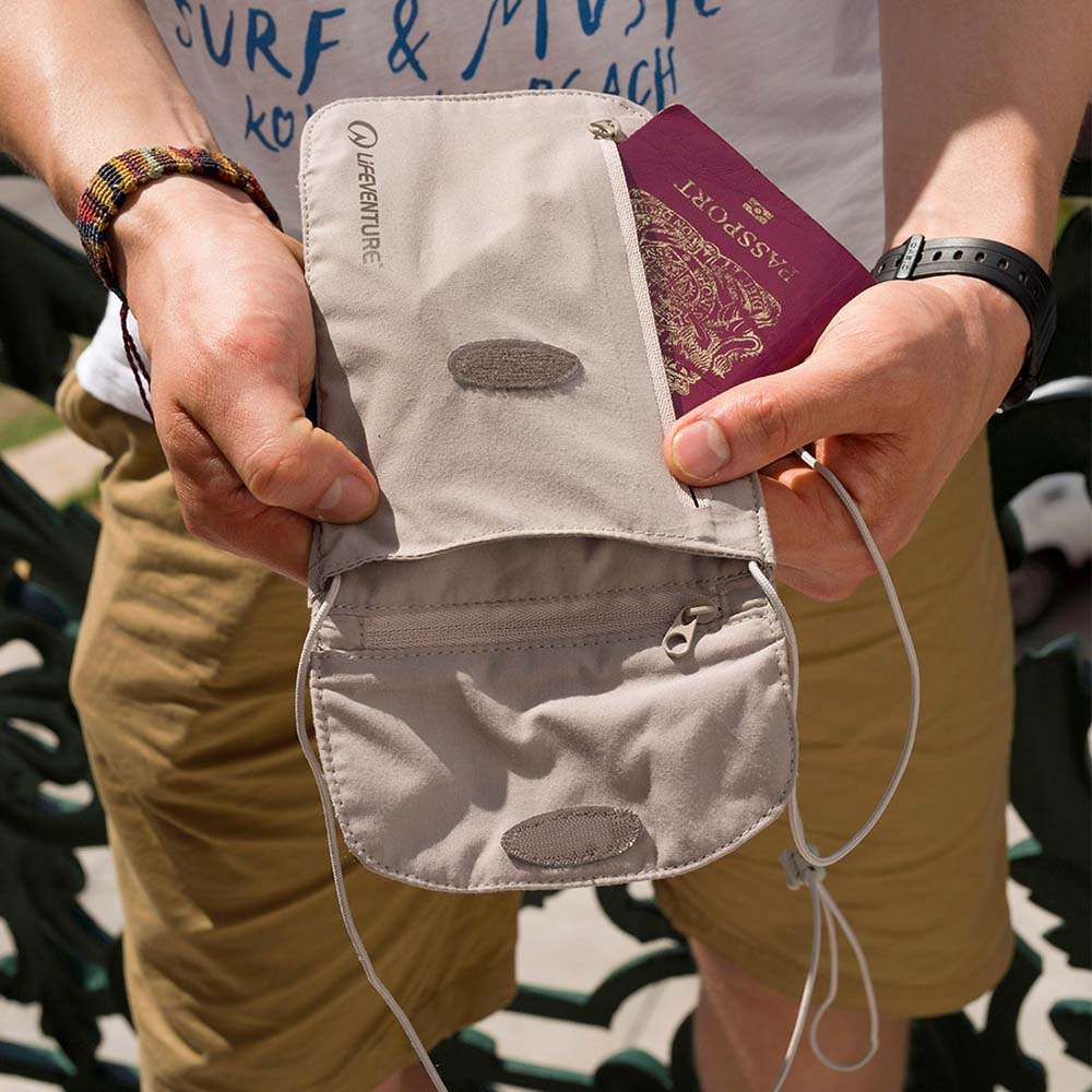 Mantenha seus itens de valor e itens pessoais seguros e de incógnito com a carteira de caixa. Projetado para ser usado sob suas roupas, o baú do corpo é suave, leve e de baixo perfil para que você possa manter seus objetos de valor confortavelmente protegidos em seu pescoço. O tecido voltado para o corpo é leve, macio e respirável para climas mais quentes e os bolsos são projetados para se adequarem ao seu passaporte e documentos.