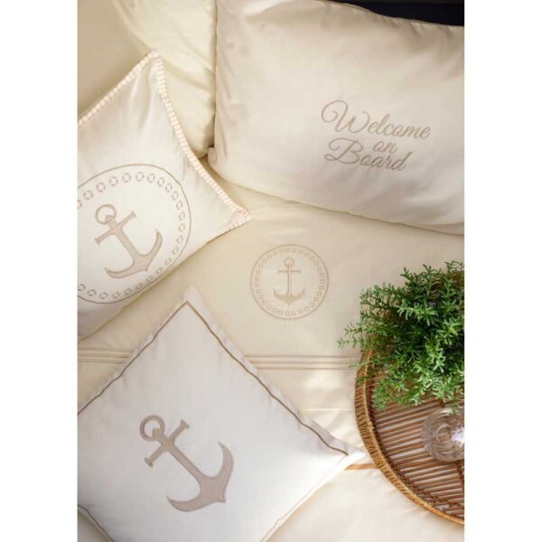 Conjunto de almofadas para barco, perfeito para cabine ou lounge. Com design náutico e detalhes bordados, os Santorini combinam com colchas e roupas de cama barco da mesma coleção.