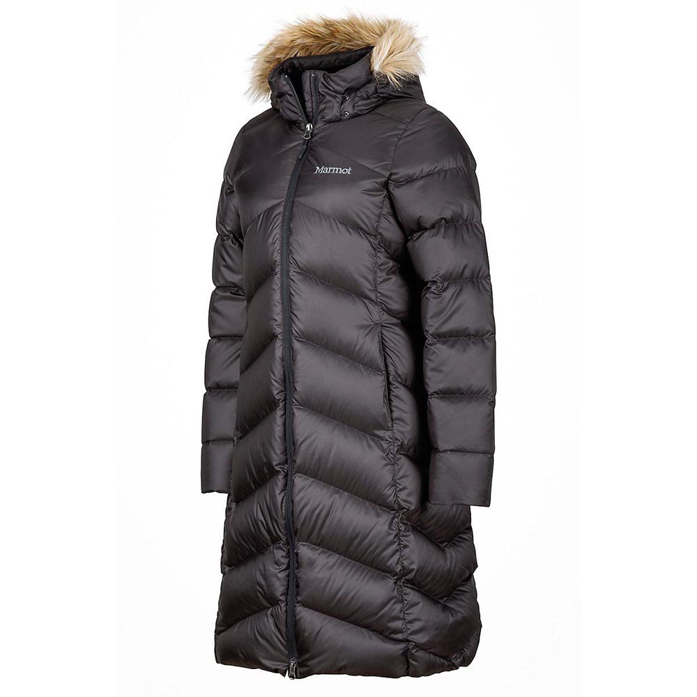 Um torso forrado com forro de veludo e manguito interno de microfibra acrescenta maciez; o capuz cheio de penas com arreios de pele removível fecha para dias ensolarados.
