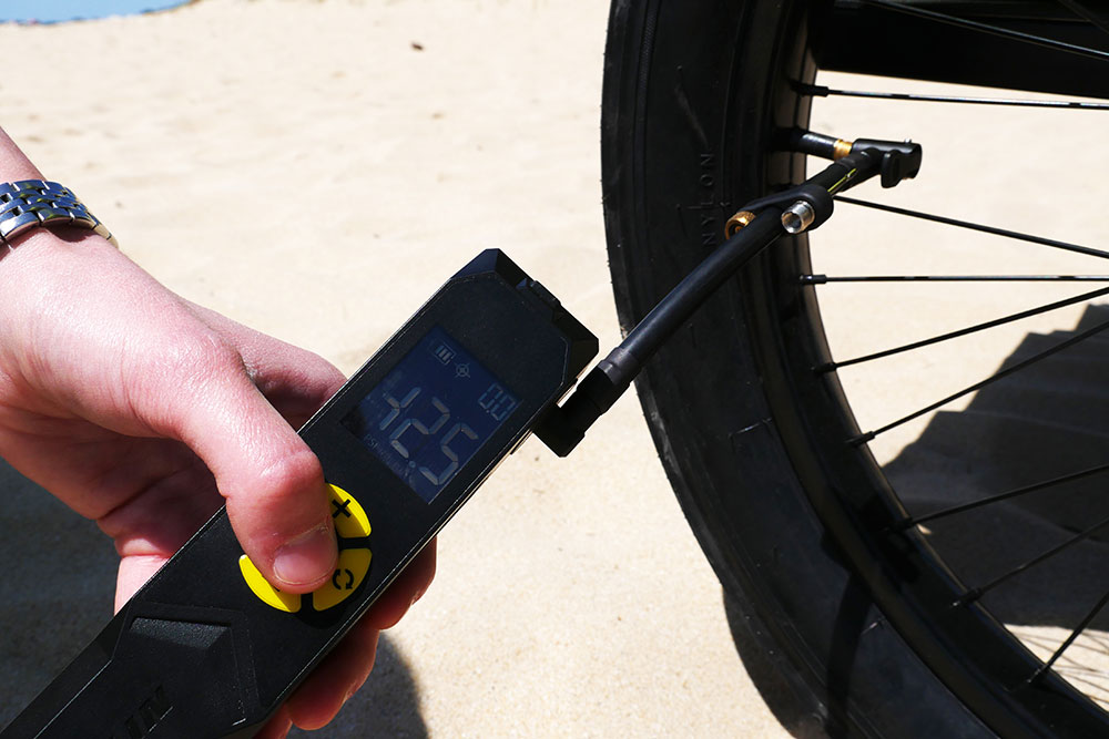 The desired pressure can be set via the digital LCD display, and there are also 4 standard settings available: 45 psi for bicycles, 2.4 bar for motorcycles, 2.5 bar for cars and 8 bar for balls. The 90 degree pump head can be easily fitted to any bike. Valve adapters for Schrader, Presta, sports and leisure valves are included. The pump can be charged via a practical micro USB port.