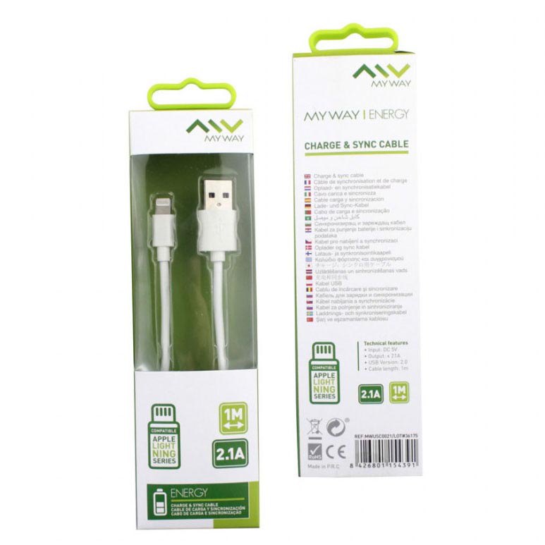 Cabo de carregamento e sincronização MyWay, com conector USB Lightning 2.1A, tem 1m de comprimento e é.