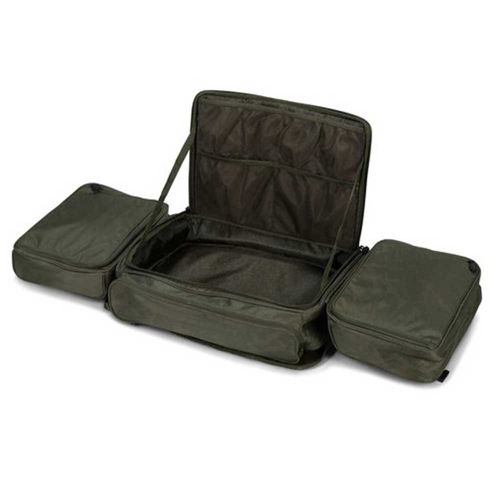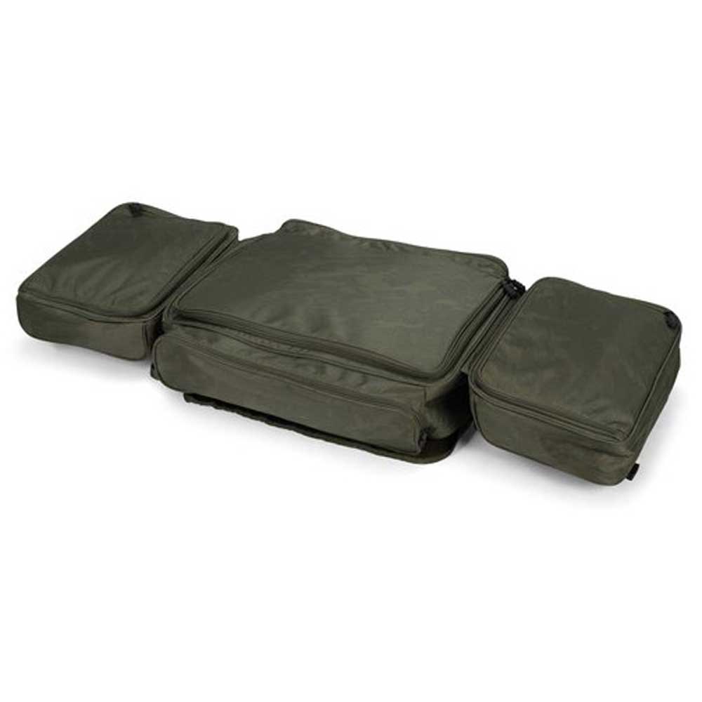 Os compartimentos finais possuem uma face superior com acabamento à prova d’água para evitar que absorvam água quando dobrados para acesso, enquanto o compartimento principal possui uma tampa com zíper com armazenamento conveniente sob a tampa com quatro bolsos pequenos e dois grandes de malha elástica e o Ruckall é forrado com o Camuflagem de padrão de micro peixe Nash.