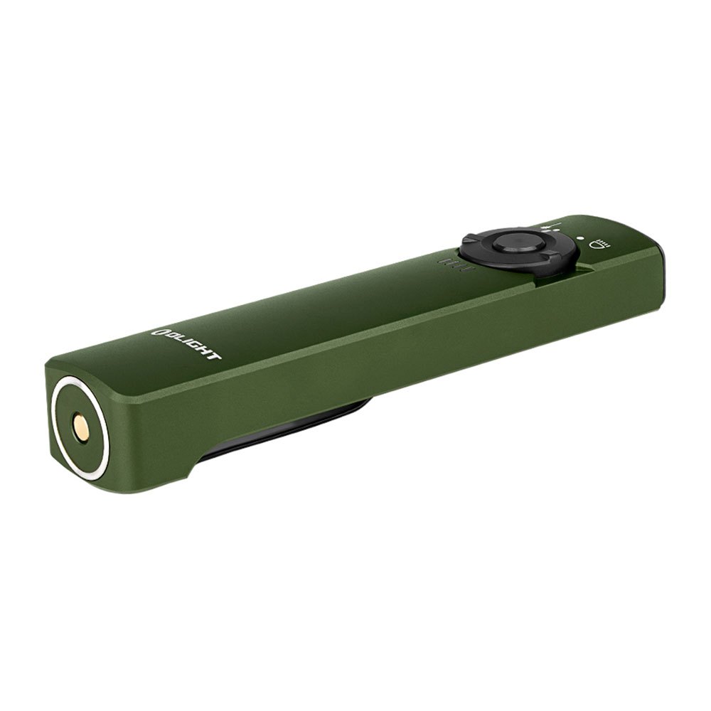 Lanterna LED portátil com laser verde integrado, interruptor lateral e botão seletor de modo.