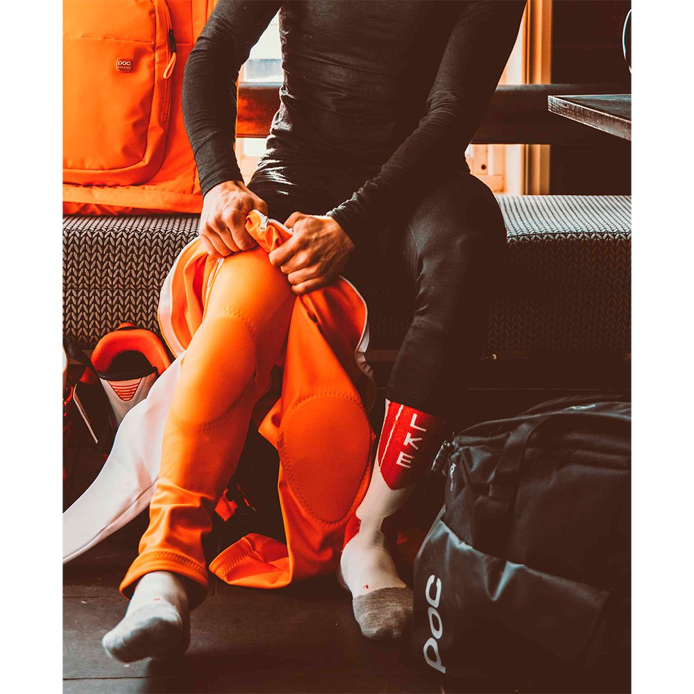 -A Base Armor é adaptada para pilotos de esqui e dá uma sensação de compressão, enquanto a adição de elasticidade garante que as meias se movam com o corpo.