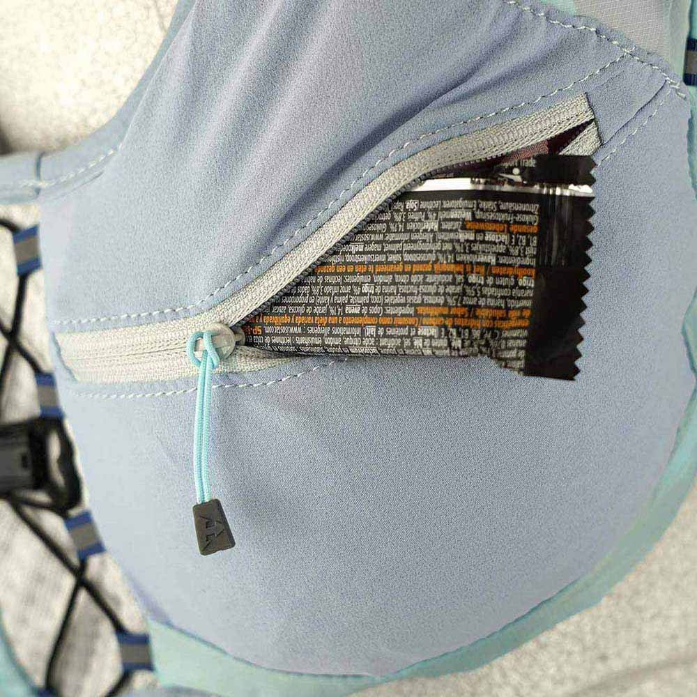 Os bolsos de armazenamento são de material elástico e fechados com zíper, para que você possa colocar muita comida e energia de maneira fácil de alcançar