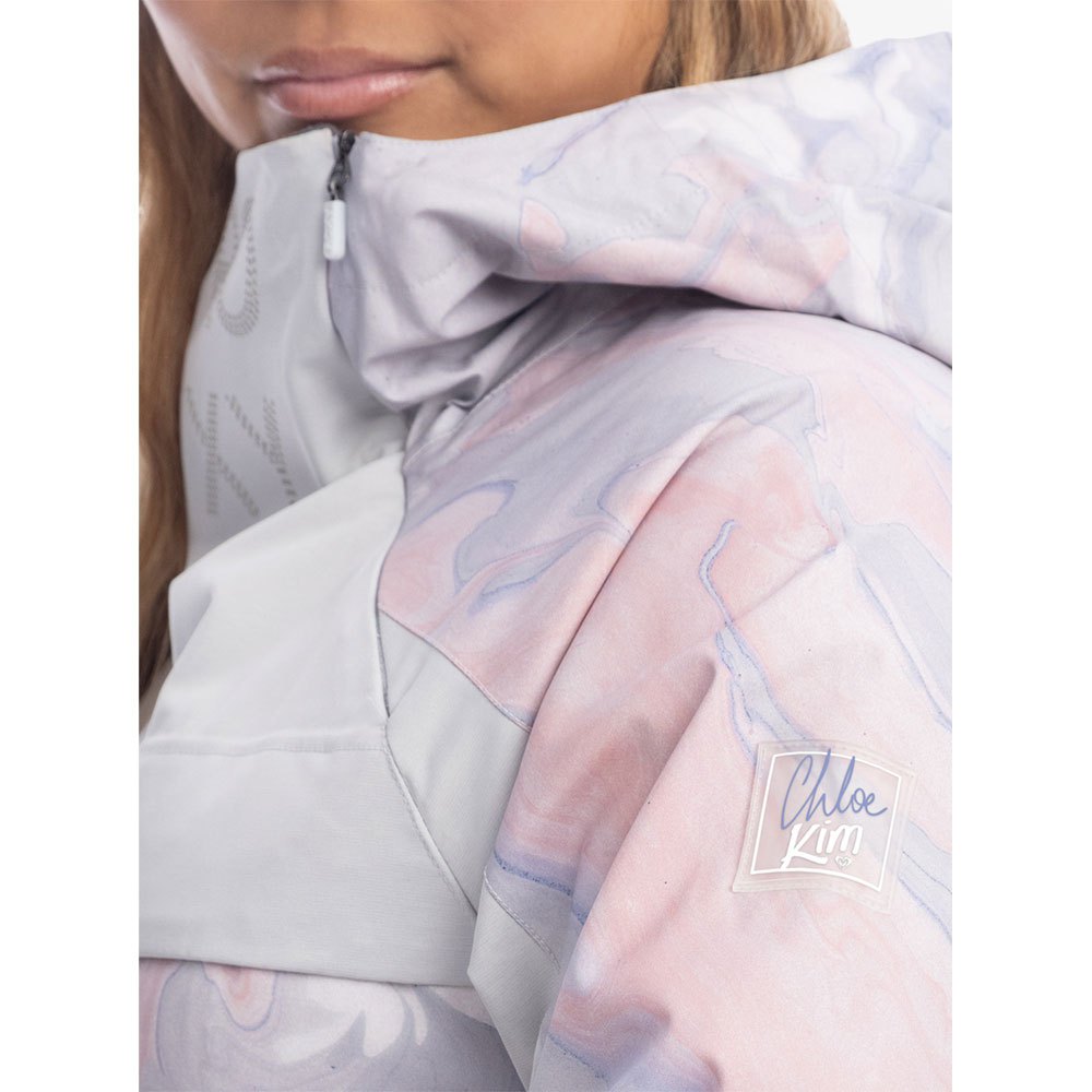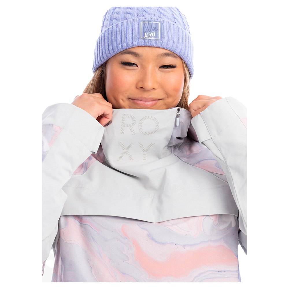 Clipe de chave, sistema de retenção do capô, saia de tafetá fixa, sistema de saia de pó snap-away, sistema de fixação de jaqueta à calça, ventilação nas axilas forradas de malha, polainas de pulso elásticas internas com orifício para o polegar, ajustador de punho de manga, protetor de queixo, tecnologia ROXY HydroSmart integrado na gola, ajustador de cintura interno.