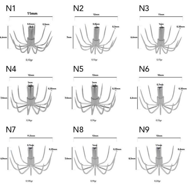 Coroas de aço inoxidável para iscas artesanais. Vendido em blister de 5 ou 100 unidades