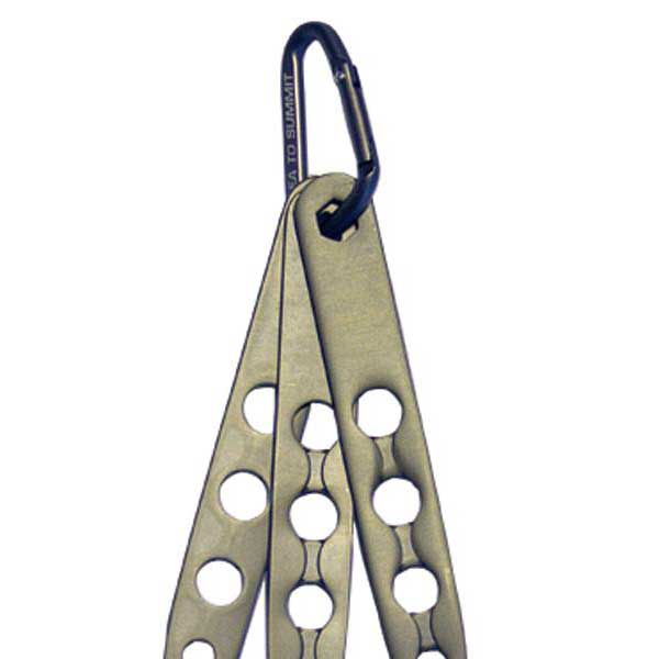 O conjunto inclui uma faca, garfo e colher (três itens) e mais uma mini-mosquetão para mantê-los juntos.