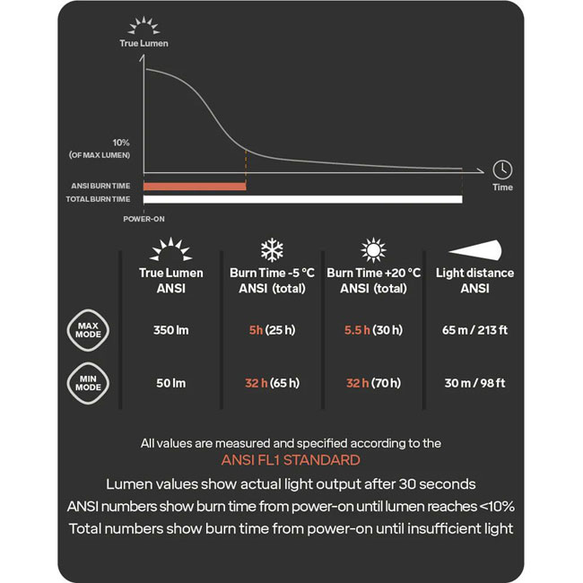 - Modo máximo: 350 lm / 3h de tempo de execução / 65m (213 pés) de distância da luz.