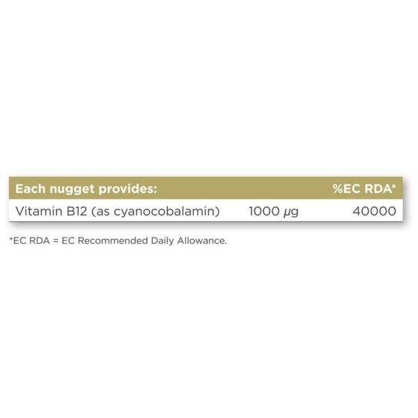 Os Nuggets de 1000 µg mastigáveis sublinguais Solgar® Vitamin B12 contêm 1000 µg da forma cianocobalamina de vitamina B12.