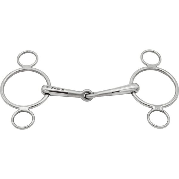 Broca de 3 anéis de 16 mm – Aço inoxidável. Articulação inovadora do bocal, girado para frente em 45°, o que significa que a superfície de contato das hastes de bits é do mesmo comprimento em ambos os lados, permitindo um efeito uniforme na língua.