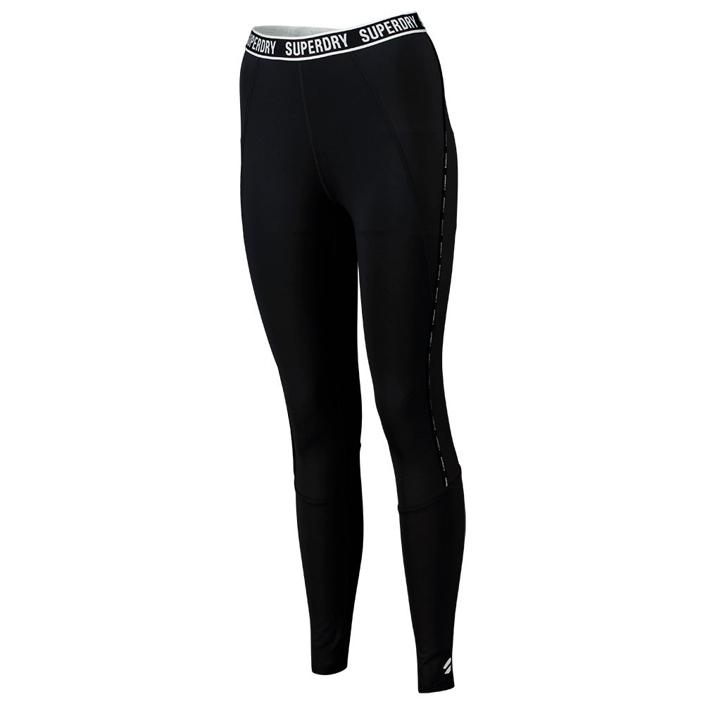 Um ajuste de modelagem corporal, justo ao corpo, materiais reciclados, cós elástico, marca Superdry na cintura, marca Superdry nos detalhes de tubulação.