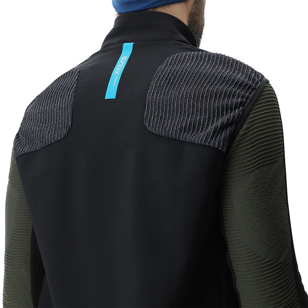 O colete UYN SPIRE apresenta maior respirabilidade graças às inserções HALOFLEX nos ombros que permitem que a umidade escape rapidamente durante o esforço intenso.