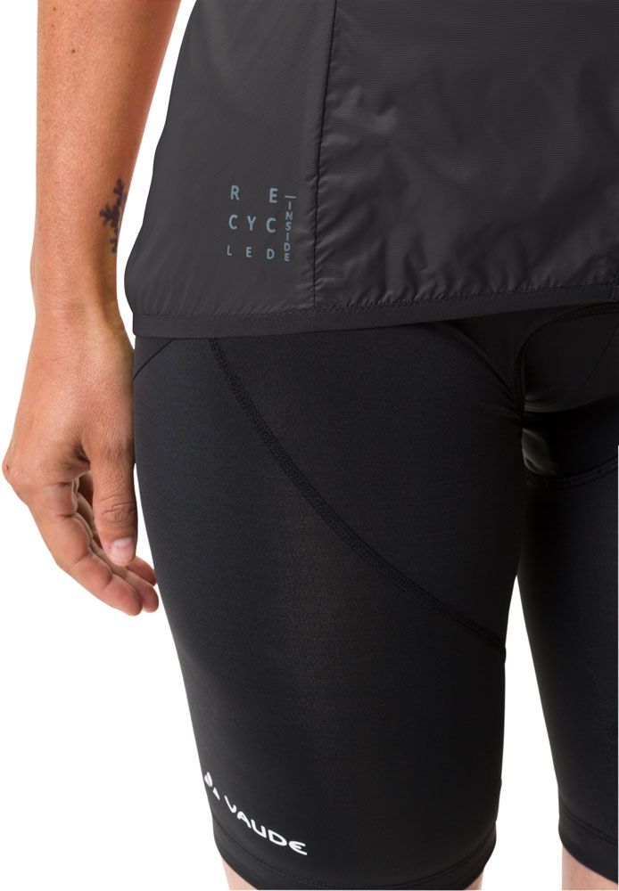 O colete de ciclismo de corte que abraça o corpo oferece sua inserção de malha permeável ao ar e elástica na parte de trás para melhor liberdade de movimento e excelente ventilação. O material principal reciclado e resistente ao vento é finalizado com repelente de água e sujeira EcoFinish, muito respirável e seca rapidamente.