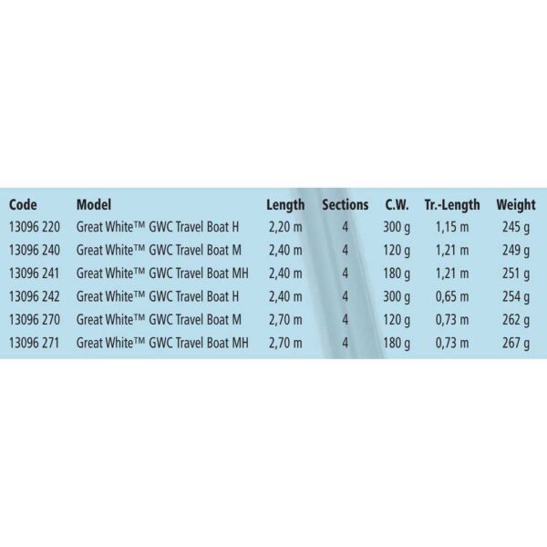 Leve, esbelto, poderoso e ultra robusto, esses são os atributos da nova série Great White. Os espaços em branco são 100% fibra de carbono, muito finos e leves na mão. Por vários anos, a tendência vem se movendo em direção a seções mais curtas, com mais e mais pescadores viajando de avião carregando um companheiro compacto. A série GWC oferece uma ampla seleção de modelos para pesca de barco em diferentes pesos e comprimentos de fundição.